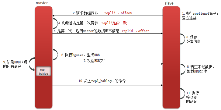 ❒ redis集群模式有以下三种 ✔ 主从复制 ✔ 哨兵模式 ✔ 分片集群 ❒ 单节点redis的并发能力是有上限的,要进一步提高redis的并发能力,就需要搭建主从集群 ✔ 实现读写分离一般都是一主多从,主节点负责写数据,从节点负责读数据。 ❒ redis主从如何进行数据同步 ✔ replication ld:简称replid,是数据集的标记,id一致则说明是同一数据集。每一个master都有唯一的replidslave则会继承master节点的replid ✔ offset:偏移量,随着记录在repl baklog中的数据增多而逐渐增大。slave完成同步时也会记录当前同步的offset. ✔ 如果replid不一致,则需要生成RDB文件,然后发送给从节点,进行数据同步(全量)。 ✔ 如果slave的offset小于master的offset,说明slave数据落后于master,需要更新(增量)。