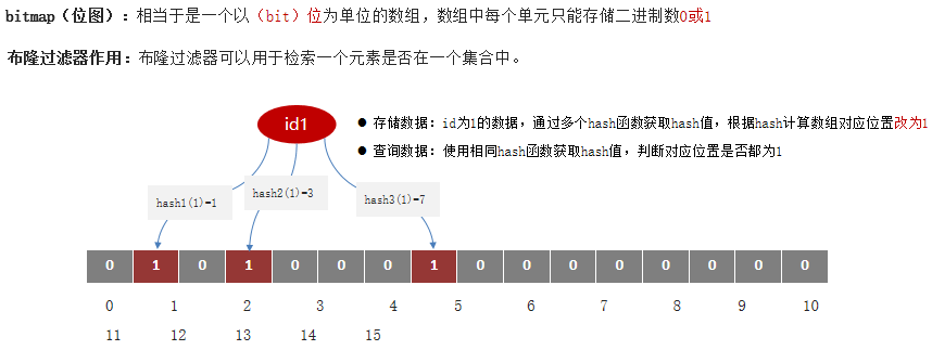 存储数据: id为1的数据,通过多个hash函数获取hash值,根据hash计算数组对应位置改为 1。