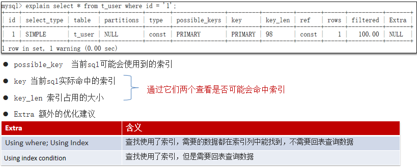 ✔ Extra → Using where; Using Index(查找使用了索引,需要的数据都在索引列中能找到,不需要回表查询数据)