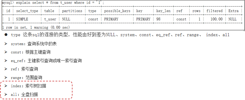 ✔ type : 这条sql的连接的类型,性能由好到差为NULL、system、const、eq_ref、ref、range、index、all