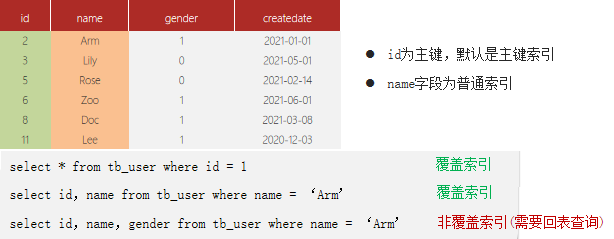 ❒ 覆盖索引是指查询使用了索引,并且需要返回的列,在该索引中已经全部能够找到 判断测试: 条件:id为主键,默认是主键索引;名称字段为普通索引。 ✔ select * from tb user where id = 1 (覆盖索引) ✔ select id, name from tb user where name = 'Arm' (覆盖索引) ✔ select id,name, gender from tb user where name = 'Arm' (非覆盖索引,需要回表査询)