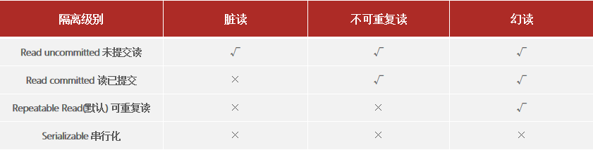 ✔ 可重复读(mysql默认隔离级别,幻读):一个事务在执行过程中可以看到其他事务已经提交的新插入的记录(所以没有解决幻读问题),但是不能看到其他其他事务对已有记录的更新(解决了不可重复读和脏读问题)。这种隔离级别防止了脏读和不可重复读;不能避免幻影读问题。